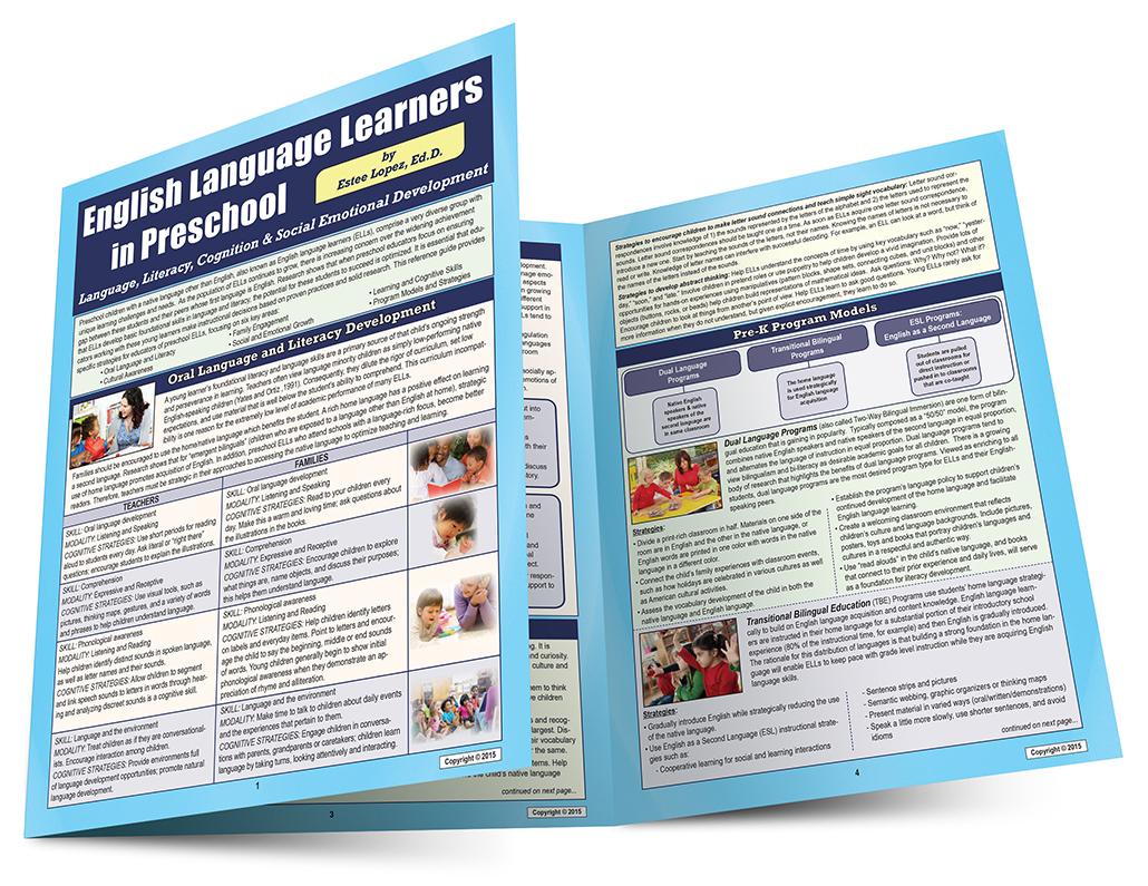 It is essential that educators working with these young learners make instructional decisions based on proven practices and solid research. This six-page laminated reference guide by Estee Lopez provides Pre-K teachers of ELLs with specific evidence-based strategies for promoting a strong language and literacy foundation. It focuses on the following six key elements: