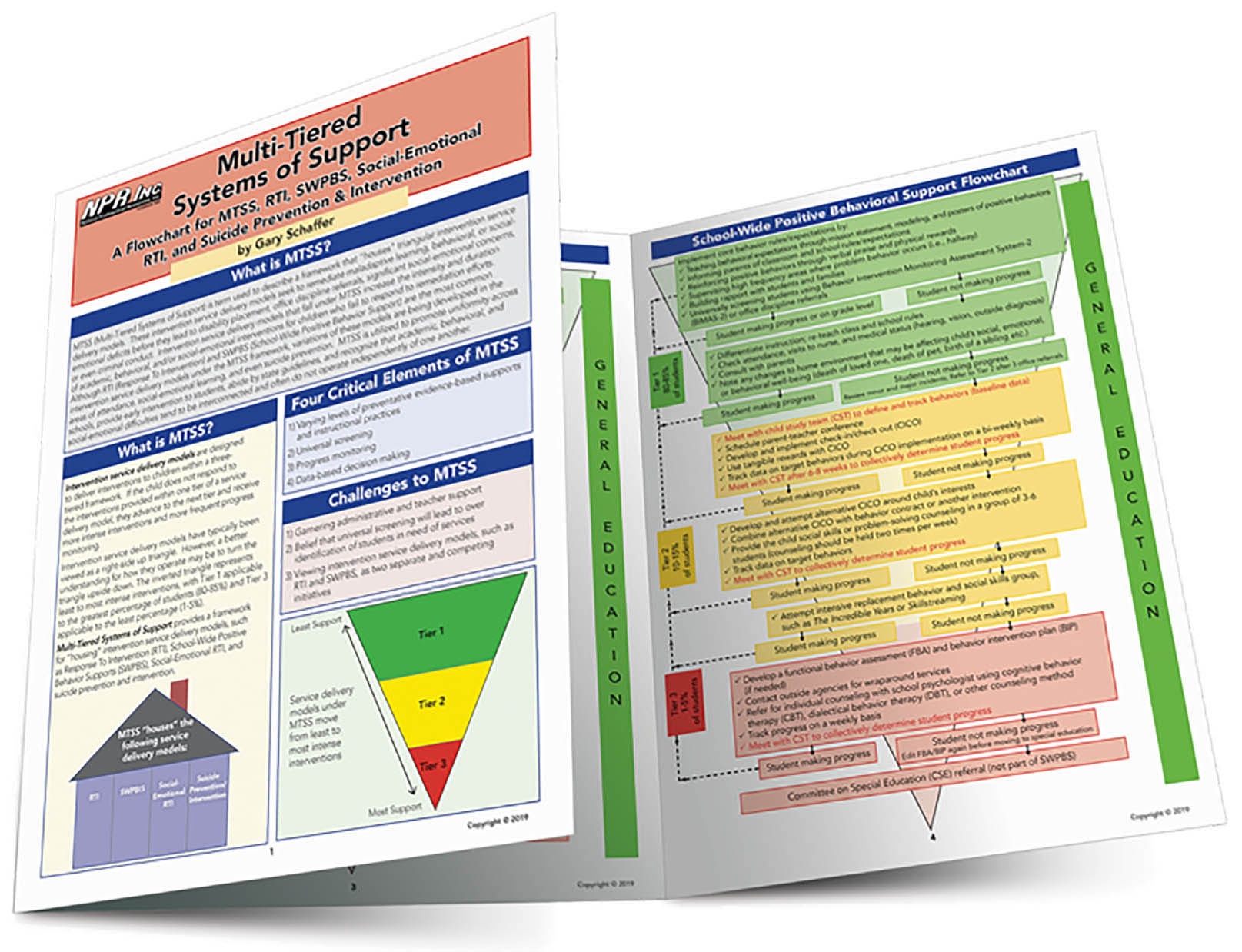 This quick-reference guide presents detailed MTSS flowcharts for academic RTI, behavior (school wide positive behavioral support/SWPBS), social-emotional RTI, and suicide prevention. Each flowchart