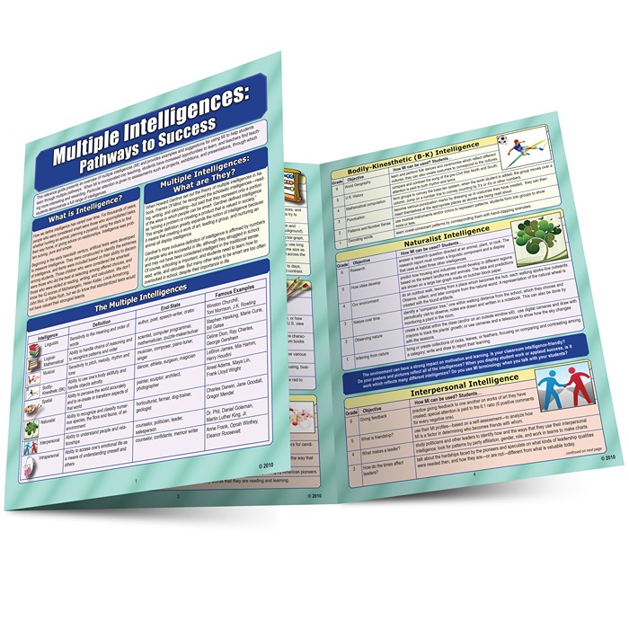 The theory of multiple intelligences (MI), developed by Howard Gardner, encompasses the belief that all students are capable of learning, but not all students learn in the same way. Individual students have unique strengths and cognitive abilities that dictate how they learn best. The laminated guide Multiple Intelligences: Pathways to Success, by Thomas R. Hoerr, is an excellent quick-reference tool for teachers that identifies the eight kinds of intelligences included in Gardner’s theory and provides suggestions for how to design instruction that is accessible through multiple pathways so that all students can learn, regardless of their dominant intelligence type.