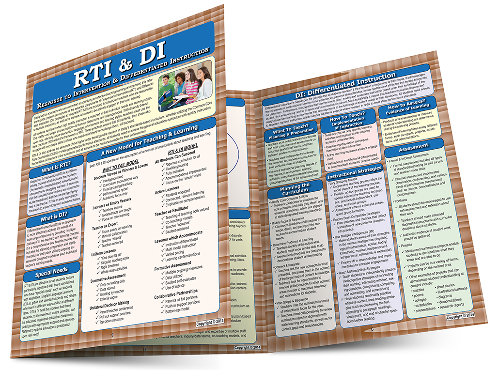 This laminated, six-page (tri-fold) guide clearly presents six common elements of RTI and DI that reflect the best practices in addressing classroom diversity within a standards-based curriculum, and provides examples for each. These include: