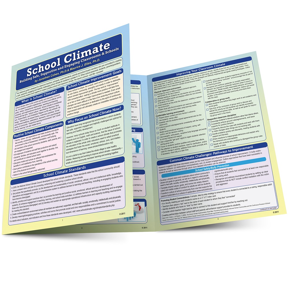 Research shows that students learn better in an environment in which they feel safe physically, intellectually and emotionally. In this six-page laminated guide, Jonathan Cohen, PhD and Maurice Elias, PhD outline the components (norms, values, expectations) and standards of school climate, explain why it is so important to educate the whole child, present a detailed plan for improving school climate, and offer dozens of practical tips and strategies for improving school climate and overcoming common challenges.