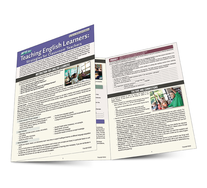 The demographics of the American classroom are changing at a rapid pace. By 2030, it is estimated that 40-50% of all classrooms throughout the country will be comprised of multilingual students who are learning English—otherwise known as English learners. This presents a challenge for teachers in linguistically diverse classrooms who are expected to meet progress expectations dictated by federal and state laws. This guide provides teachers with information that will help them understand and set expectations for language development. It also provides strategies that incorporate best practices for helping English learners develop content knowledge through language.